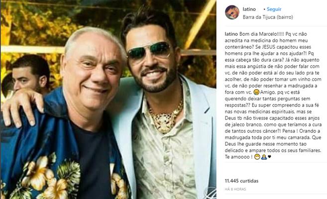 Latino decidiu se pronunciar sobre o estado de saúde de Marcelo Rezende, nesta sexta-feira (15)! O cantor usou seu perfil do Instagram para questionar o tratamento alternativo que Marcelo Rezende escolheu seguir no combate do câncer.