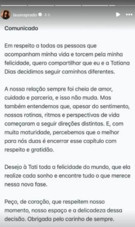 “Em respeito a todas as pessoas que acompanham minha vida e torcem pela minha felicidade, quero compartilhar que eu e Tatiana Dias decidimos seguir caminhos diferentes”, iniciou a artista, nos stories do Instagram.