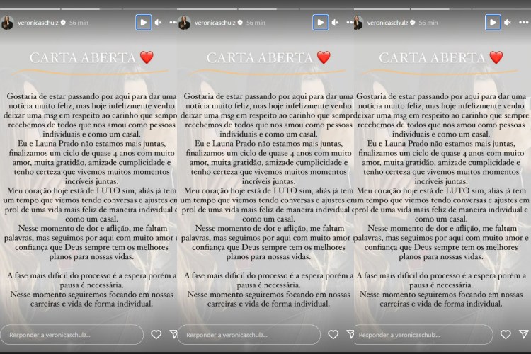 Minutos depois, foi a vez de Veronica deixar uma carta aberta aos fãs nos Stories da mesma rede social: “Gostaria de estar passando por aqui para dar uma notícia muito feliz, mas hoje, infelizmente, venho deixar uma mensagem em respeito ao carinho que sempre recebemos de todos que nos amou como pessoas individuais e como um casal”, declarou a influenciadora.
