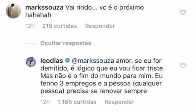 Logo em seguida, Leo Dias respondeu: “Amor, se eu for demitido, é lógico que eu vou ficar triste. Mas não é o fim do mundo para mim. Eu tenho 3 empregos, e a pessoa (qualquer pessoa) precisa se renovar sempre”.