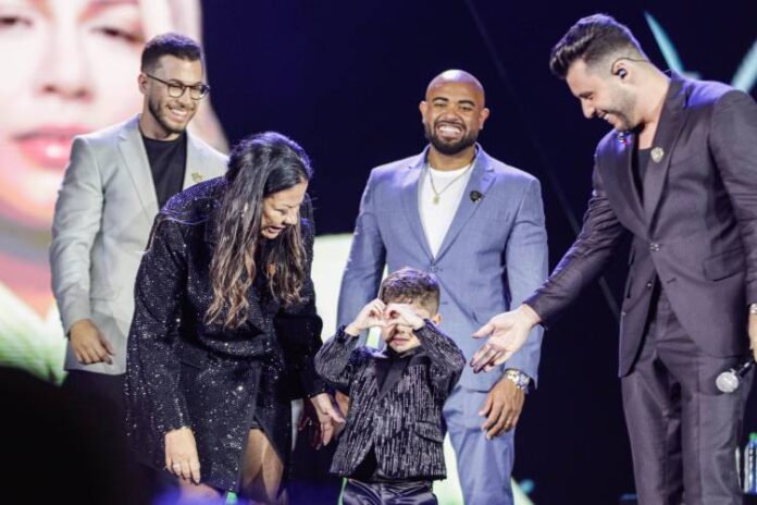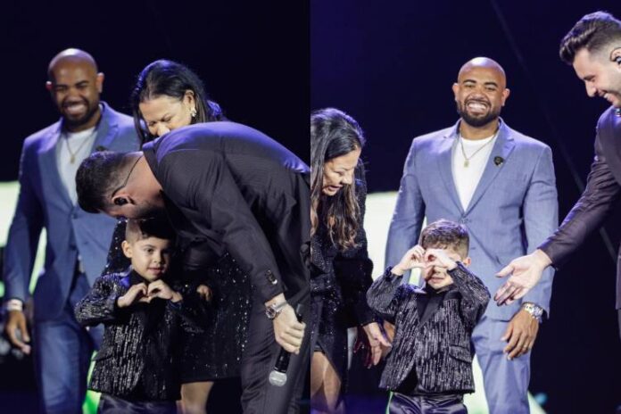 Na noite do último sábado, 05 de outubro, Léo Mendonça, de apenas quatro anos, subiu ao palco do ‘This is Marilia Mendonça‘, evento em homenagem a matricarca dele, que faleceu em 2021 em um acidente aéreo. O herdeiro da artista, que estava acompanhado do pai, Murilo Huff, e da avó materna, Dona Ruth, mandou um coração com as mãos em direção ao público, que lotou o Allianz, em São Paulo.