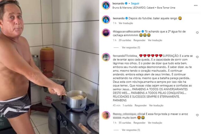 “Arrozinho pra gente comer depois do futevôlei. Vai ficar só o ouro. Tem cebola e alho“, disse o cantor, revelando que estava fazendo o almoço. “O tempero da comida é cachaça, certeza”, brincou um seguidor. “Admiro muito a simplicidade de Leonardo”, destacou outro. “Mestre da Música Sertaneja! O Pai e a Mãe da Humildade!! Você é um exemplo… Abraços Fraternos… Sou fãzaço”, completou outro.