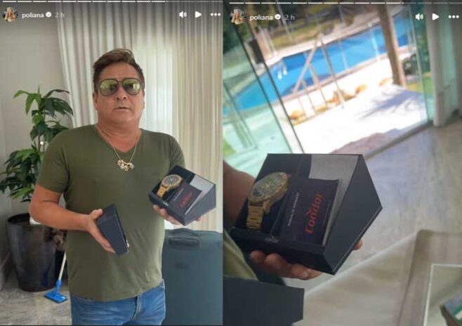 No Story, Leonardo aparece abrindo alguns “recebidos”. Ele segura na mão uma caixa contendo um lindo relógio. “Gente, ele chegou e também tem recebidos. Que lindo!”, diz Poliana ao mostrar o presente. Sem perder o bom humor, Leonardo responde: “É recebido que chama? É recebido então, mas eu não sei quem foi que deu”, afirma antes de ler o bilhete enviado junto com o mimo.