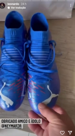 O presente enviado do atleta que joga no PSG, ao artista, foi uma linda e estilosa chuteira de cor azul. Leonardo fez questão de dizer que amou a lembrança e agradeceu: