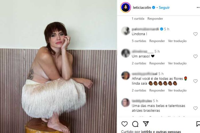Letícia Colin compartilhou com seus seguidores no Instagram cliques em que aparece fazendo topless e exibindo suas tatuagens. Aproveitando o momento para desejar uma boa semana a todos os seus seguidores, a atriz de 34 anos recebeu diversos elogios nos comentários.
