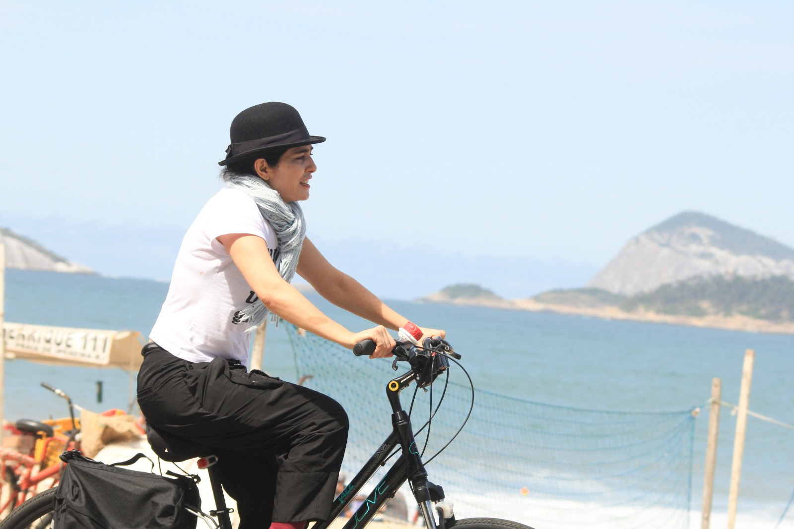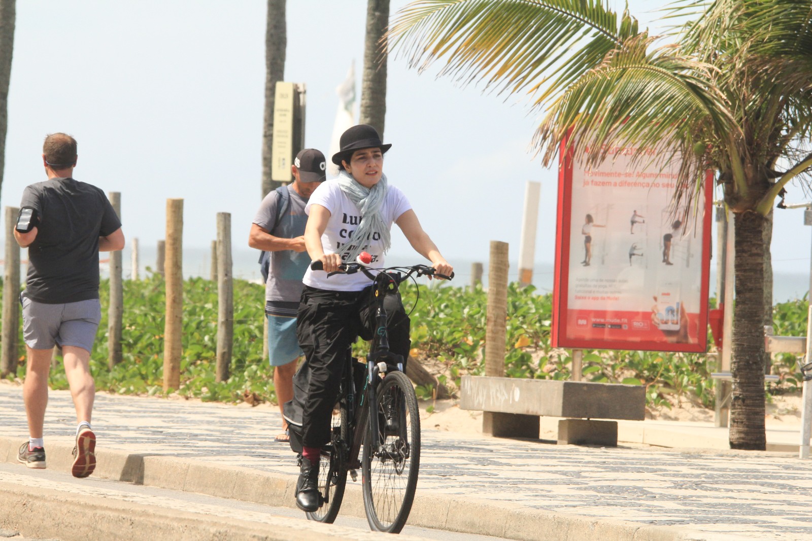 Nesta quinta-feira (29), a atriz foi flagrada, passeando de bicicleta, pela orla de Ipanema, usando um look confortável, com chapéu e lenço.