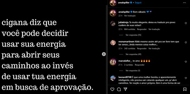 Na tarde de ontem, 23 de março, através de sua conta oficial do Instagram, a artista publicou uma série de frases misteriosas e deixou os admiradores com uma pulga atrás da orelha. Uma delas diz o seguinte: ”Cigana diz que você pode usar sua energia para abrir seus caminhos ao invés de usar tua energia em busca de aprovação”.