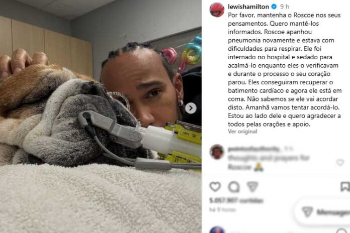 Em seu perfil no Instagram, nesta sexta-feira (26), Hamilton compartilhou registros ao lado do animal, diagnosticado com pneumonia. O piloto aproveitou ainda para pedir boas vibrações para Roscoe, dizendo que os veterinários ainda não sabem ao certo se ele vai acordar.