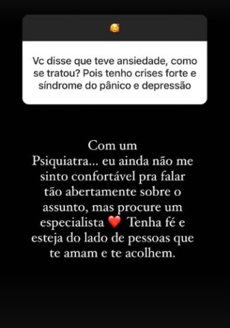 “Você disse que teve ansiedade. Como se tratou? Pois tenho crises fortes, síndrome do pânico e depressão”, pediu a seguidora.