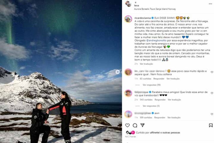 Ricardo ainda se declarou para a cantora, dizendo que espera a fazer a mulher mais feliz do mundo. “Eu te amo tanto! Espero conseguir te fazer a mulher mais feliz desse mundo! Obrigado @andregbonotto por essa experiência magnífica, por trabalhar com tanta energia e amor e por ser o melhor caçador de Auroras da Noruega! Como um amante da natureza, digo que não poderíamos ter uma benção maior do que a noite de ontem. Cercado por montanhas, mar ao nosso lado e aurora boreal dançando no céu. Deus é bom o tempo todo!”, agradeceu.