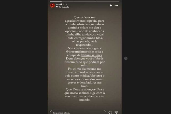 Lexa agradeceu a médica obstetra responsável por realizar o seu parto em Stories compartilhado no Instagram. A primeira filha da cantora, Sofia, morreu três dias após o seu nascimento.