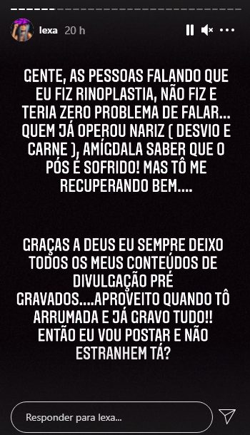 “Gente, as pessoas falando que eu fiz rinoplastia, não fiz e teria zero problema de falar… quem já operou o nariz (desvio e carne), amígdala sabe que o pós é sofrido!”.