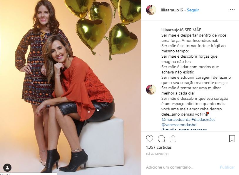 Lilia Araújo, ex-mulher do cantor sertanejo Eduardo Costa, postou um click ao lado da sua filha, Maria Eduardo, nas redes sociais na noite desta terça-feira (7).
