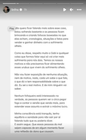 Lincoln Lau, por sua vez, regressou aos seus perfis nas redes sociais e deu contornos adicionais de sua versão acerca dos eventos vividos entre o casal nas últimas semanas. Em nota, o gamer garantiu ter a consciência limpa diante das acusações que sofre, insinuando, por outro lado, que tenha sido ele a vítima de um alegado comportamento desmedido levado a efeito pela então companheira.