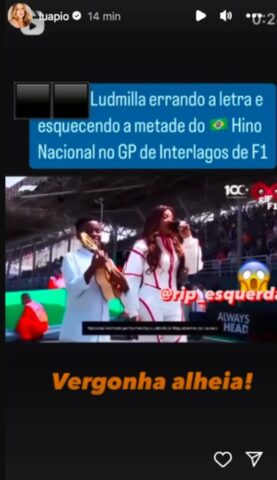 Dessa forma, após a falha técnica no som viralizar, Luana Piovani acabou compartilhando uma das criticas, aonde estava escrito que a situação sofrida por Ludmilla era na verdade uma ‘vergonha alheia’. “Ludmilla errando a letra e esquecendo a metade do hino nacional no GP de Interlagos de F1. Vergonha alheia“, estava escrito na publicação dela divulgada nos stories do Instagram.