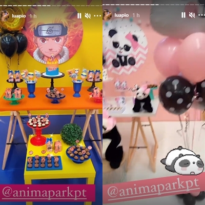 Na comemoração, os pequenos bolos com temas diferentes para Liz, tinha o tema de pandinhas, tudo nas cores rosa, preto e branco, enquanto a de Bem era do Naruto, nos tons laranja e azul.