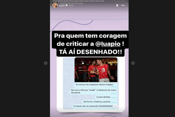 Na legenda, a atriz ainda falou sobre o assunto. “Para quem tem coragem de criticar a Luana Piovani, tá aí desenhado”, diz a legenda. Na mensagem, ainda é possível ver um texto escrito o seguinte: “Eu nunca vou esquecer dessa imagem. Ele com a fita para ‘medir’ a distância da Maria da Penha. C*zão demais. Ela foi lá, chamou a polícia e tiraram ele do camarote”.