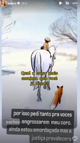 Dessa forma, através dos stories do Instagram, Luana Piovani desabafou sobre o assunto, envolvendo a guarda dos filhos com Pedro Scooby e compartilhou uma imagem de um ‘desenho infantil’ e disparou na legenda: “Por isso pedi tanto para vocês engrossarem o meu coro. Ainda estou amordaçada, mas a justiça prevalecerá“, enfatizou ela.