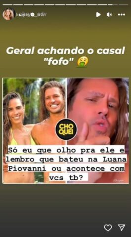 No vídeo que Piovani repostou em sua conta oficial do Instagram Stories, uma mulher dizia o seguinte: ”Se tá ruim pra você, imagina pra quem tá com meu ex (risos). E tá achando que encontrou o presente de Deus (risos). Eu conto ou vocês contam?”. A apresentadora também republicou um outro Story: ”Só eu que olho pra ele e lembro que bateu na Luana Piovani ou acontece com vocês também?”. Luana ainda escreveu: ”Geral achando o casal [Dado e Wanessa] ‘fofo’ [emoji de vômito]”, apontou.