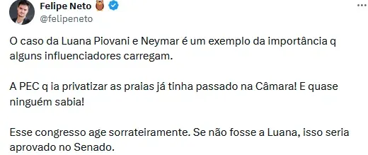 “O caso da Luana Piovani e Neymar é um exemplo da importância que alguns influenciadores carregam. A PEC que iria privatizar as praias já tinha passado na Câmara e quase ninguém sabia”, destacou o criador de conteúdo através de seu perfil no X (antigo Twitter), rede social de Elon Musk.