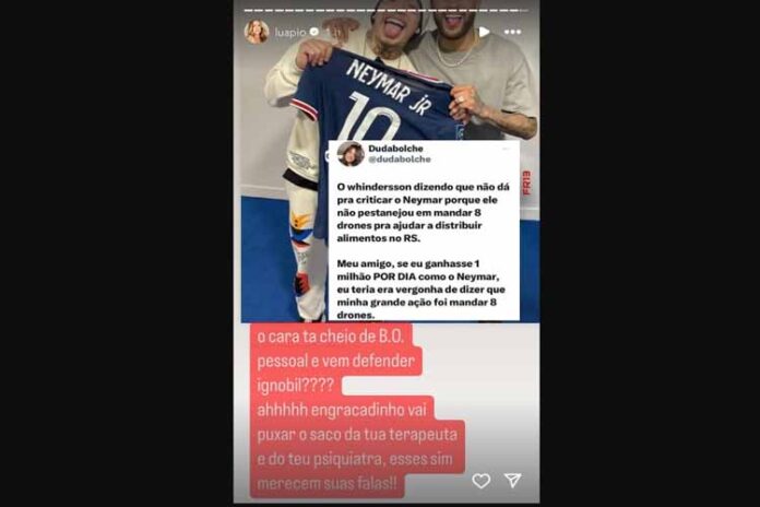 A atriz e o jogador trocaram farpas nos últimos dias envolvendo o assunto. Agora, Luana teceu críticas a Whindersson, afirmando que o humorista estaria “puxando o saco” do atacante.
