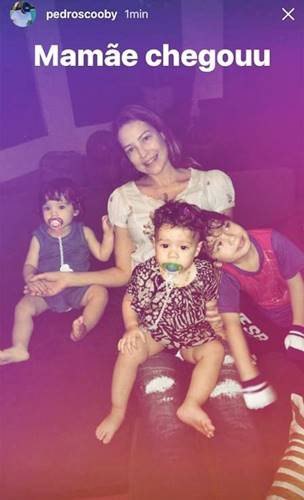 Mais tarde o ex-marido, Pedro Scooby compartilhou no Snapchat um registro de Luana com os três filhos e avisou: “Mamãe chegou”.