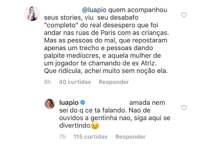 Em seu Instagram, ao ser questionada por uma seguidora sobre o comentário de Belle, Luana Piovani não teve papas na língua: “Amada, nem sei do que você tá falando. Não dê ouvidos a gentinha não. Siga aqui se divertindo”.
