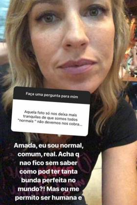 “Esse corpo aqui é o meu templo, ele me serve. Eu sou completamente apaixonada por ele. Estou fazendo uma mudança de país com três filhos pequenos, estou louca, ansiosa e estou trabalhando bastante! O que significa que eu não estou com tempo disponível para malhar, fazer o aeróbico, essas coisas todas que a gente faz para ficar com o corpinho melhor. Eu sou natural, real, e eu acho isso incrível. Então, tudo bem. (…) Fiquem felizes as que ficaram felizes que me viram gordinha e com celulites, e critique quem quiser criticar também, tá tudo lindo meu amor”, continuou falando que não se importava com essa exposição.