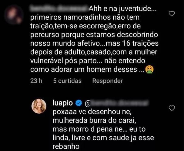 Dessa forma, por meio de um comentário em uma postagem no Instagram, um internauta destacou: “Na juventude, primeiros namoradinhos não tem traição, tem-se escorregão, erro de percurso, porque estamos descobrindo nosso mundo afetivo. Mas 16 traições depois de adulto, casado, com a mulher vulnerável pós-parto… não entendo como adorar um homem desses”, escreveu um fã de Luana.