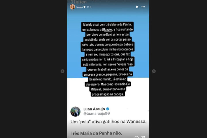 “Marido atual com três Maria da Penha, em ex-famosa a Luana Piovani, e fica surtando por birra com o Davi. Aí nem estou assistindo, só de ver os cortes passo raiva”, inicia a atriz. Na sequência, ela também faz críticas ao comportamento dos jovens e de algumas empresas.