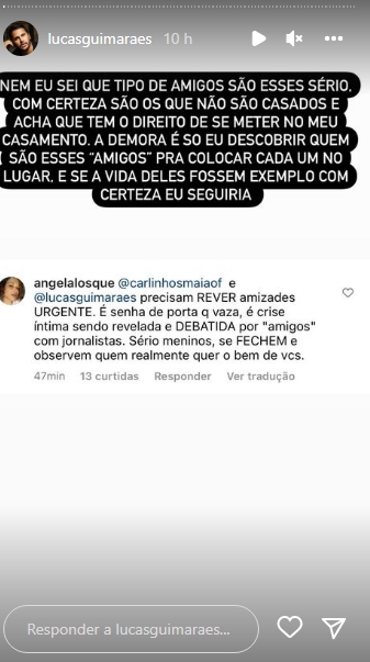 Sendo assim, em reposta a internauta, Lucas destacou: “Nem eu sei que tipos de amigos são esses, sério. Com certeza são os que não são casados e acham que têm o direito de se meterem no meu casamento. A demora é só eu descobrir quem são esses ‘amigos’ para colocar cada um no lugar. E se a vida deles fosse exemplo, com certeza eu seguiria”, frisou ele revoltado.