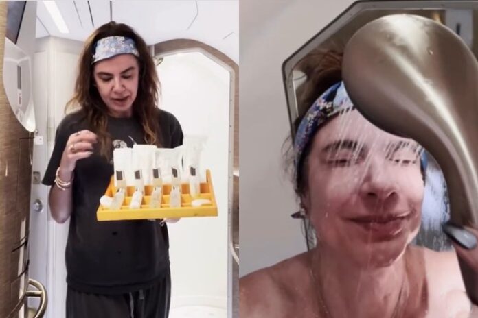 No feed do Instagram, Luciana Gimenez compartilhou imagens inéditas e encantou seus milhares de seguidores com o puro luxo da aeronave e, claro, o desafio que é tomar banho nas alturas. “Vou mostrar tudo para vocês: o famoso banheiro do avião, onde cada movimento é um desafio e apertar o botão errado pode te dar um mini ataque cardíaco“, publicou ela.