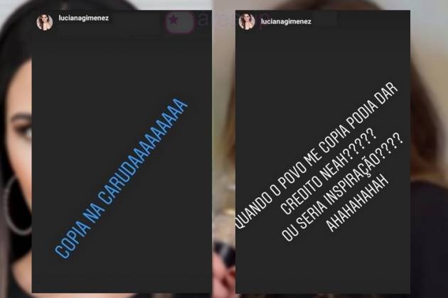 Livremente inspirada na modelo e socialite ricaça Kim Kardashian, Luciana sempre é recepcionada com inúmeros elogios ao publicar fotografias semelhantes, mas no caso de Daniela não funcionou da mesma forma. Diante da forte repercussão, Gimenez recorreu por meio do recurso Stories, no Instagram, e como forma de indireta, rasgou o verbo: “Copia na caruuuuuda”, disparou a famosa. “Quando o povo me copia podia dar o crédito, né? Ou seria inspiração?”, debochou.