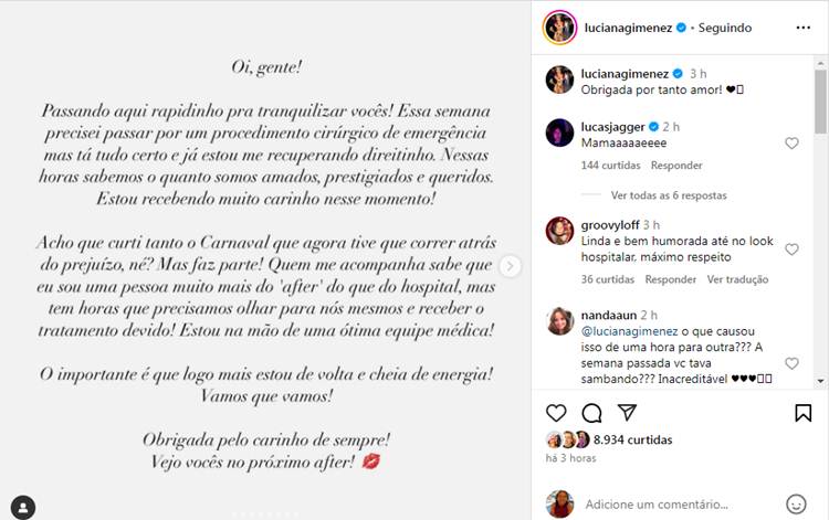 Em seu perfil no Instagram, Luciana Gimenez fez um post para tranquilizar os fãs. “Passando aqui rapidinho para tranquilizar vocês! Essa semana precisei passar por um procedimento cirúrgico de emergência, mas está tudo certo e já estou me recuperando direitinho. Nessas horas sabemos o quanto somos amados, prestigiados e queridos. Estou recebendo muito carinho nesse momento!”, escreveu.