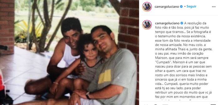 “A resolução da foto não é tão boa, pois já faz muito tempo que tiramos… Se a fotografia é o testemunho da nossa existência, esse tom da foto revela a intensidade de nossa amizade. No meu colo, a minha afilhada Thais e, junto da gente, o seu pai, meu irmão de coração Mairson, que para mim será sempre ‘Cumpadi’. Mairson é um ser que nasceu para doar para as pessoas sem olhar a quem, um cara que traz no rosto um dos sorrisos mais lindos e sinceros que já vi em toda a minha vida”, declarou ele.