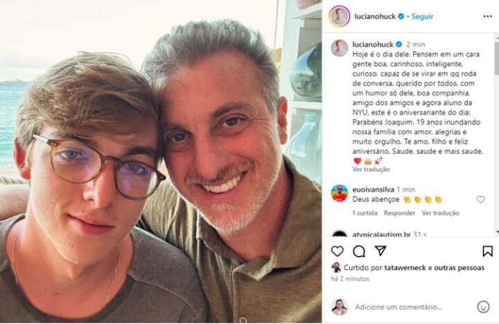 Por meio das redes sociais, Luciano Huck compartilhou um lindo clique com Joaquim, chamando bastante atenção pela semelhança entre eles, escrevendo: “Hoje é o dia dele. Pensem em um cara gente boa, carinhoso, inteligente, curioso, capaz de se virar em qq roda de conversa, querido por todos, com um humor só dele, boa companhia, amigo dos amigos e agora aluno da NYU, este é o aniversariante do dia; Parabéns Joaquim. 19 anos inundando nossa família com amor, alegrias e muito orgulho. Te amo, filho e feliz aniversário. Saúde, saúde e mais saúde“, escreveu o comandante do ‘Domingão’ na Globo.