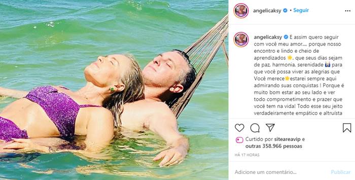 “E assim quero seguir com você meu amor…porque nosso encontro e lindo e cheio de aprendizados, que seus dias sejam de paz, harmonia, serenidade para que você possa viver as alegrias que você merece. Estarei sempre aqui admirando suas conquistas! Porque é muito bom estar ao seu lado e ver todo comprometimento e prazer que você tem na vida! Todo esse seu jeito verdadeiramente empático e altruísta com as pessoas me inspiram e fazem acreditar em um mundo melhor. Te amo! Viva, seja, sinta”, escreveu a loira.