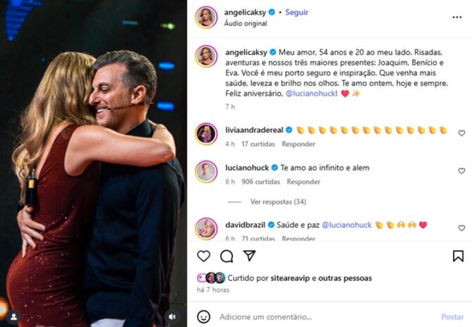 No feed do Instagram, Angélica compartilhou um vídeo com imagens e uma linda declaração ao marido, enfatizando na legenda: “Meu amor, 54 anos e 20 ao meu lado. Risadas, aventuras e nossos três maiores presentes: Joaquim, Benício e Eva. Você é meu porto seguro e inspiração. Que venha mais saúde, leveza e brilho nos olhos. Te amo ontem, hoje e sempre. Feliz aniversário”, escreveu ela.