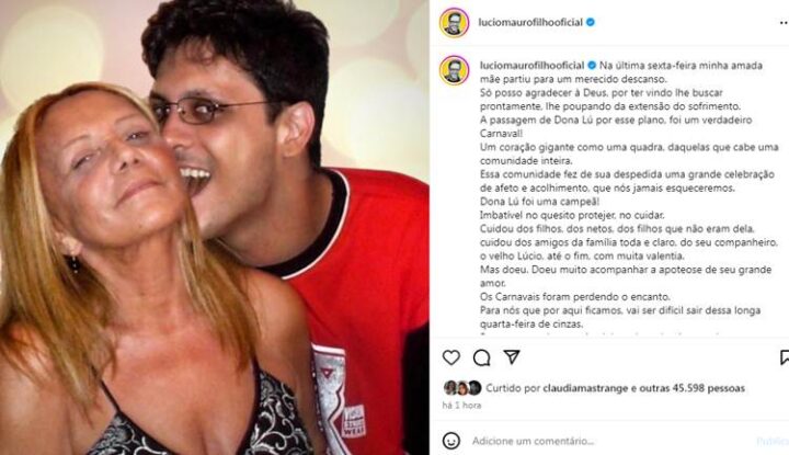 O artista ainda encheu a mãe de elogios. “A passagem de Dona Lú por esse plano, foi um verdadeiro Carnaval! Um coração gigante como uma quadra, daquelas que cabe uma comunidade inteira. Essa comunidade fez de sua despedida uma grande celebração de afeto e acolhimento, que nós jamais esqueceremos. Dona Lú foi uma campeã!”, continuou.