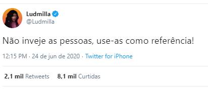 “Não inveje as pessoas, use-as como referência!”, escreveu a esposa de Brunna Gonçalves. Em seguida, comentários de fãs de Anitta começaram a surgir na postagem. “Lud avisa que ela ta voltando”, escreveu uma fã da poderosa, ao falar sobre uma nova música que será lançada em breve. Para a briga continuar, um fã de Ludmilla respondeu com um vídeo anunciando a música que será lançada pela cantora em breve: “Ela já sabe more, mas obrigada por avisar”.