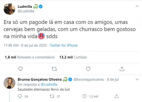 “Era só um pagode lá em casa com os amigos, umas cervejas bem geladas, com um churrasco bem gostoso na minha vida. Saudades”, escreveu ela no Twitter.