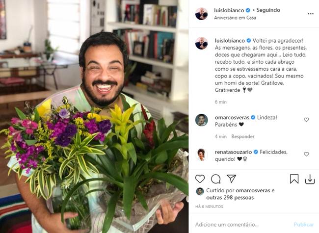 Mais tarde, ele voltou à rede social para agradecer o carinho dos amigos e dos fãs. “Voltei pra agradecer! As mensagens, as flores, os presentes, doces que chegaram aqui… Leio tudo, recebo tudo, e sinto cada abraço como se estivéssemos cara a cara, copo a copo, vacinados! Sou mesmo um homi de sorte! Gratilove, Grativerde”, escreveu na legenda da foto onde aparece com um lindo arranjo de flores.