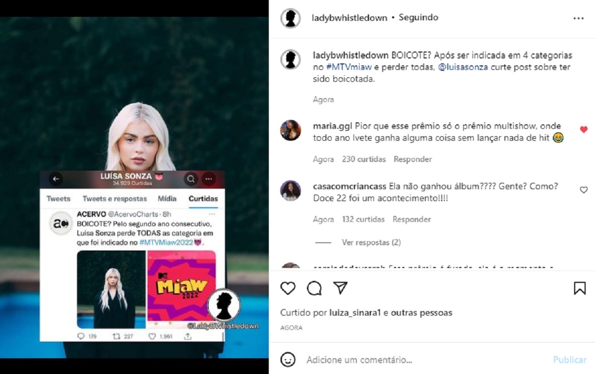 ”BOICOTE? Pelo segundo ano consecutivo, Luísa Sonza perde TODAS as categoria em que foi indicado no #MTVMiaw2022”, dizia a publicação que a cantora deu like. Outros usuários da web também apontaram uma injustiça da premiação tendo em vista o destaque da cantora atualmente.