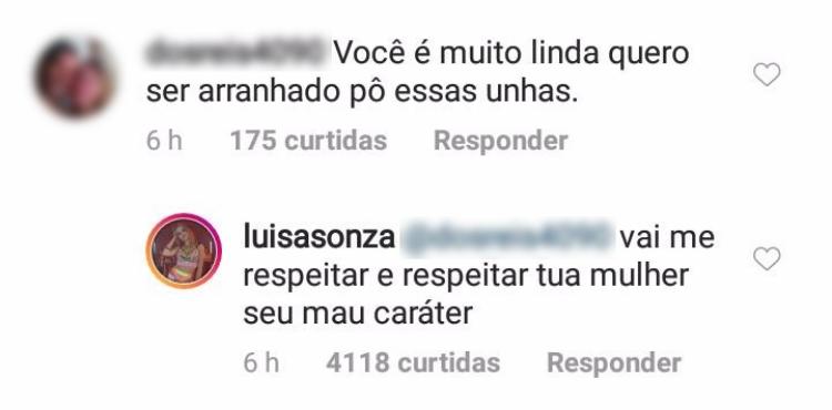 Ao se dar conta da mensagem do seguidor, Luísa resolveu mandar um recado para o mesmo: “Vai me respeitar e respeitar tua mulher, seu mau caráter”, escreveu ela.