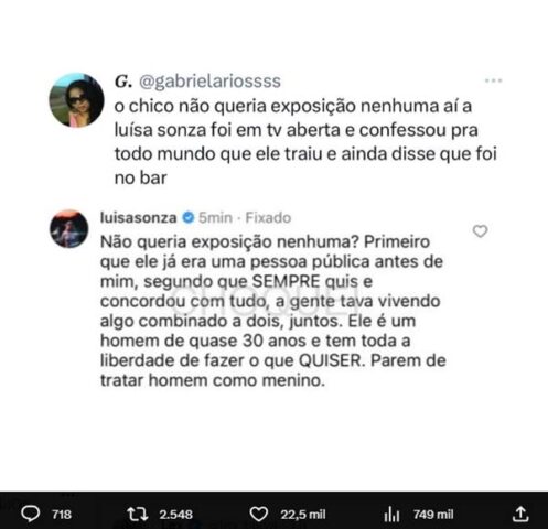 Dessa forma, após revelar a traição na TV Globo, Luísa Sonza recebeu a seguinte crítica no Twitter: “O Chico não queria exposição nenhuma aí a Luísa Sonza foi em TV aberta e confessou pra todo mundo que ele traiu e ainda disse que foi no bar“, reclamou a internauta.