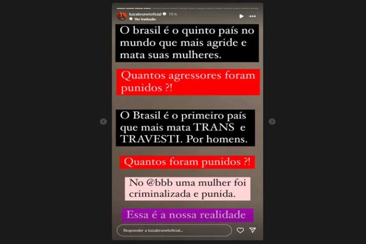 “Aqui fora, as mulheres são mortas todos os dias, são espancadas por homens, são retaliadas. E a sociedade, muitas vezes, não enxerga e não pune o agressor”, disse. “Por que isso é tão seletivo?”, criticou a mãe de Yasmin Brunet ao citar novamente os comentários feitos em relação ao corpo de sua filha durante a atração.