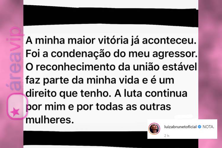 Em suas redes sociais, Luiza Brunet desabafou e rasgou o verbo com uma reflexão daquelas sobre a continuação na luta do combate de violência contra as mulheres. “A minha maior vitória já aconteceu. Foi a condenação do meu agressor, O reconhecimento da união estável faz parte da minha vida e é um direito que tenho. A luta continua e por todas as outras mulheres”, declarou a famosa em sua conta oficial do Instagram.