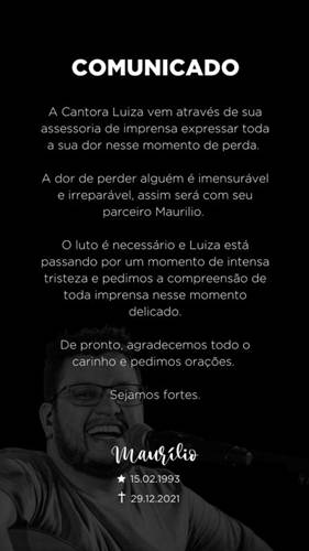 Através de sua assessoria, a cantora expressou seus sentimentos. “A Cantora Luiza vem através de sua assessoria de imprensa expressar toda a sua dor nesse momento de perda. A dor de perder alguém é imensurável e irreparável, assim será com seu parceiro Maurílio”, diz a nota.