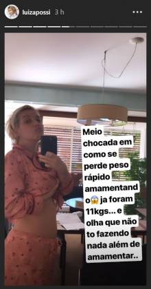 Luiza usou os stories de seu Instagram para compartilhar com os seus seguidores que já está vendo mudança em seu corpo, mesmo em tão pouco tempo que deu à luz. Na publicação, a cantora revelou quantos quilos já perdeu apenas com a amamentação.