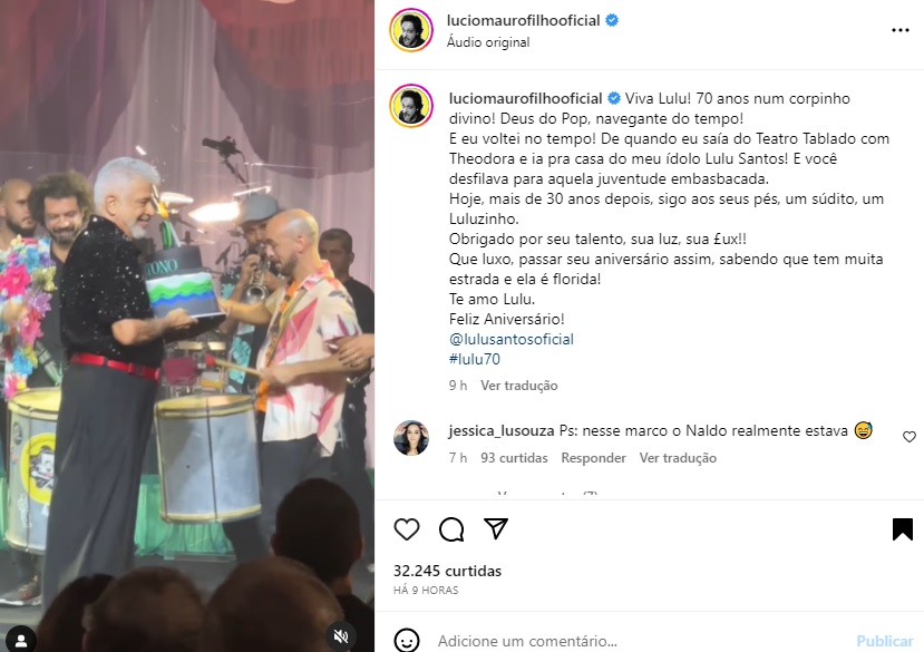 Assim, apontou: “Viva Lulu! 70 anos num corpinho divino! Deus do Pop, navegante do tempo! E eu voltei no tempo! De quando eu saía do Teatro Tablado com Theodora e ia pra casa do meu ídolo Lulu Santos! E você desfilava para aquela juventude embasbacada. Hoje, mais de 30 anos depois, sigo aos seus pés, um súdito, um Luluzinho”.